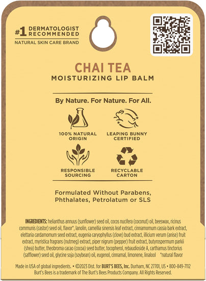 Chai Tea Lip Balm Blister by Burts Bees is a moisturizing balm made with beeswax, cinnamon, cardamom, clove, nutmeg, pepper, and tea extracts that deliver sweet and spicy natural flavor.