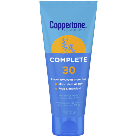 Coppertone Complete Sunscreen Lotion provides everyday sun protection for the whole family. With a multi-benefit formula that helps your skin in more ways than one, this moisturizing sunscreen protects you from the sun with a durable and water resistant sunscreen formula (80 minutes). Coppertone Complete Sunscreen Lotion offers broad spectrum UVA/UVB protection that feels lightweight and moisturizes all day.(1) This Coppertone sunscreen SPF 30 lotion can be used as a daily sunscreen and is also free from oxybenzone, octinoxate, parabens, PABA, phthalates and dyes. Each sunscreen Coppertone creates follows a tradition of trusted, quality sun protection products. Coppertone has been providing continuous innovation for more than 75 years, and is voted the most trusted sunscreen brand.(2) (1)for sun protection, use as directed (2)Voted Most Trusted Sunscreen Brand by American Shoppers Based on the 2021 BrandSpark American Trust Study.