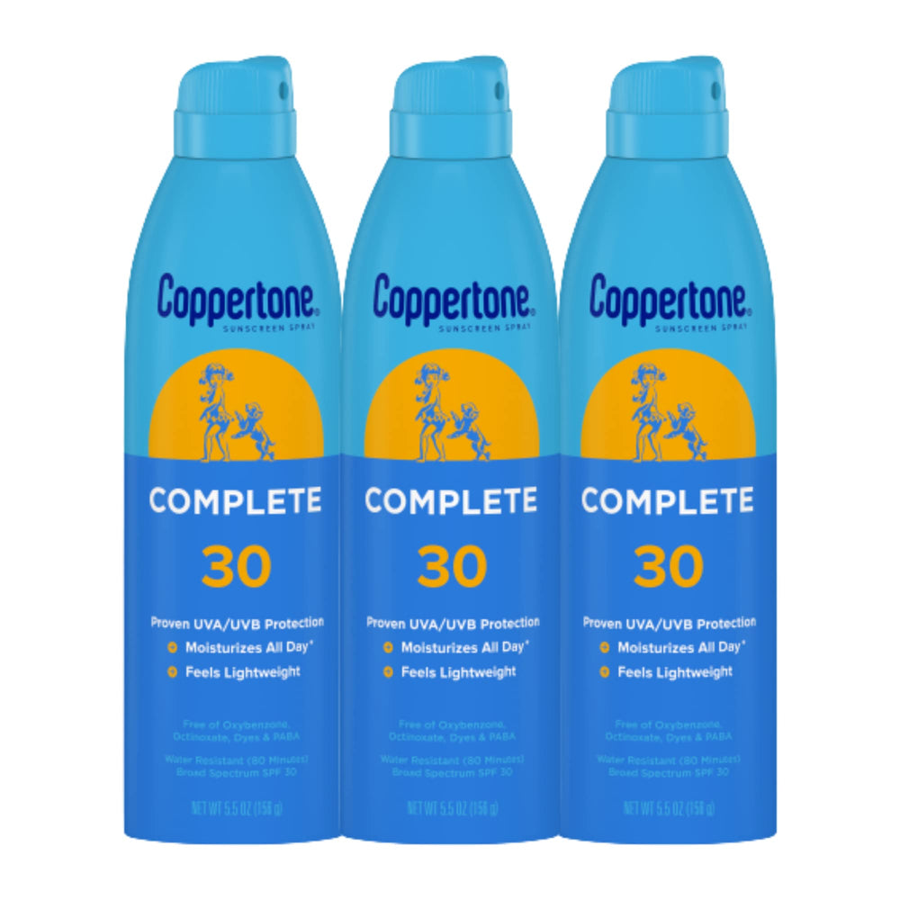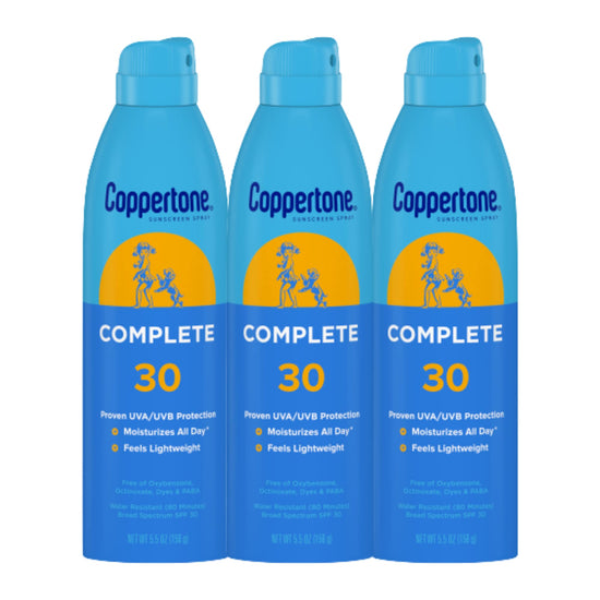 Coppertone Complete Sunscreen Spray provides everyday sun protection for the whole family. With a multi-benefit formula that helps your skin in more ways than one, this spray on sunscreen protects you from the sun with a durable and water resistant sunscreen formula (80 minutes). Coppertone Complete Sunscreen Spray offers broad spectrum UVA/UVB protection that feels lightweight and moisturizes all day.(1) This sunscreen spray SPF 30 has a continuous sprayer for application on any angle. This Coppertone sunscreen spray is also free from oxybenzone, octinoxate, PABA, phthalates and dyes. Each sunscreen Coppertone creates follows a tradition of trusted, quality sun protection products. Coppertone has been providing continuous innovation for more than 75 years, and is voted the most trusted sunscreen brand.(2) (1)for sun protection, use as directed (2)Voted Most Trusted Sunscreen Brand by American Shoppers Based on the 2021 BrandSpark American Trust Study.