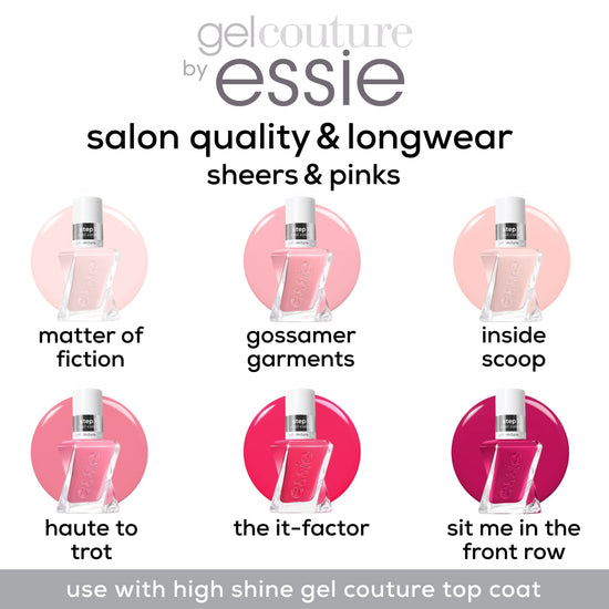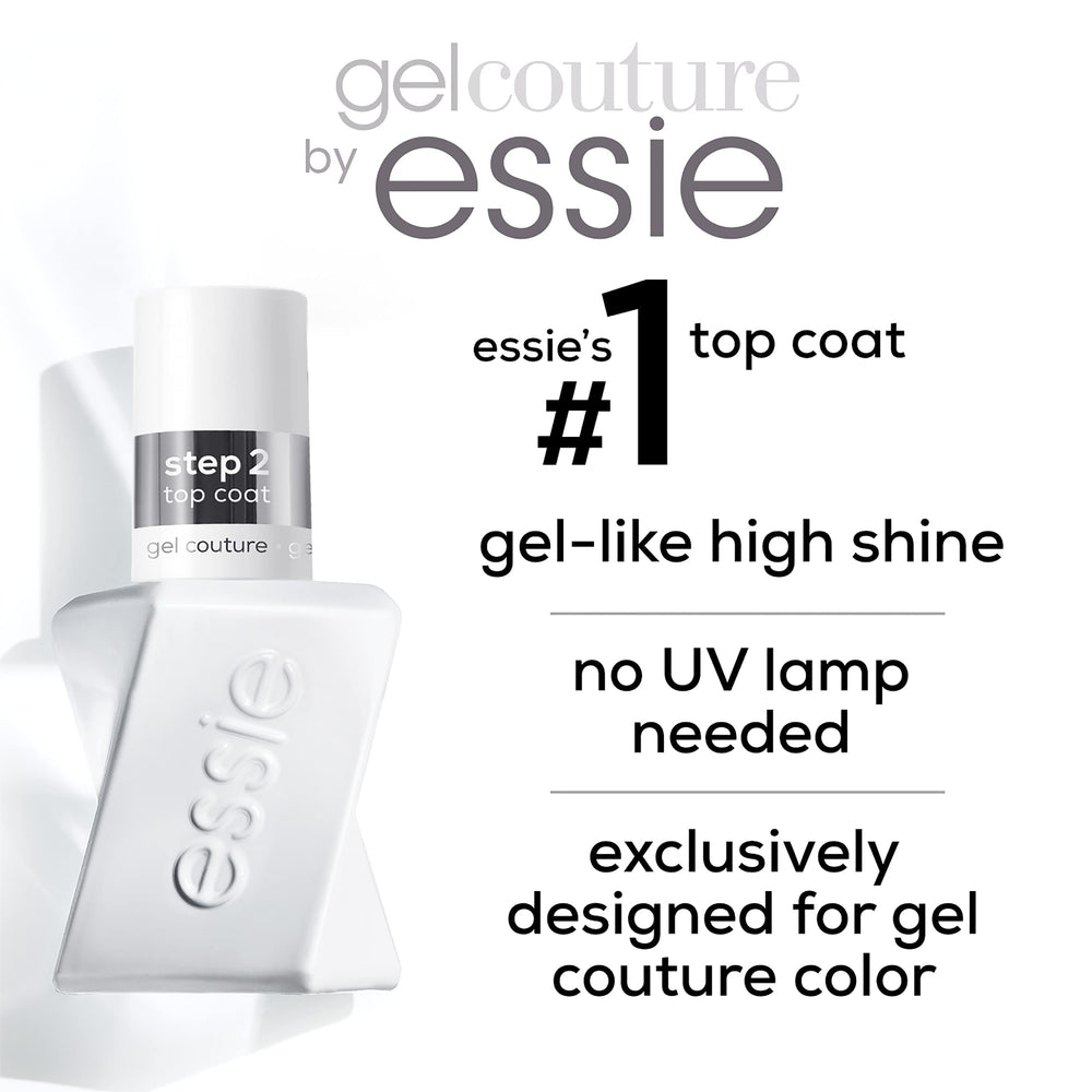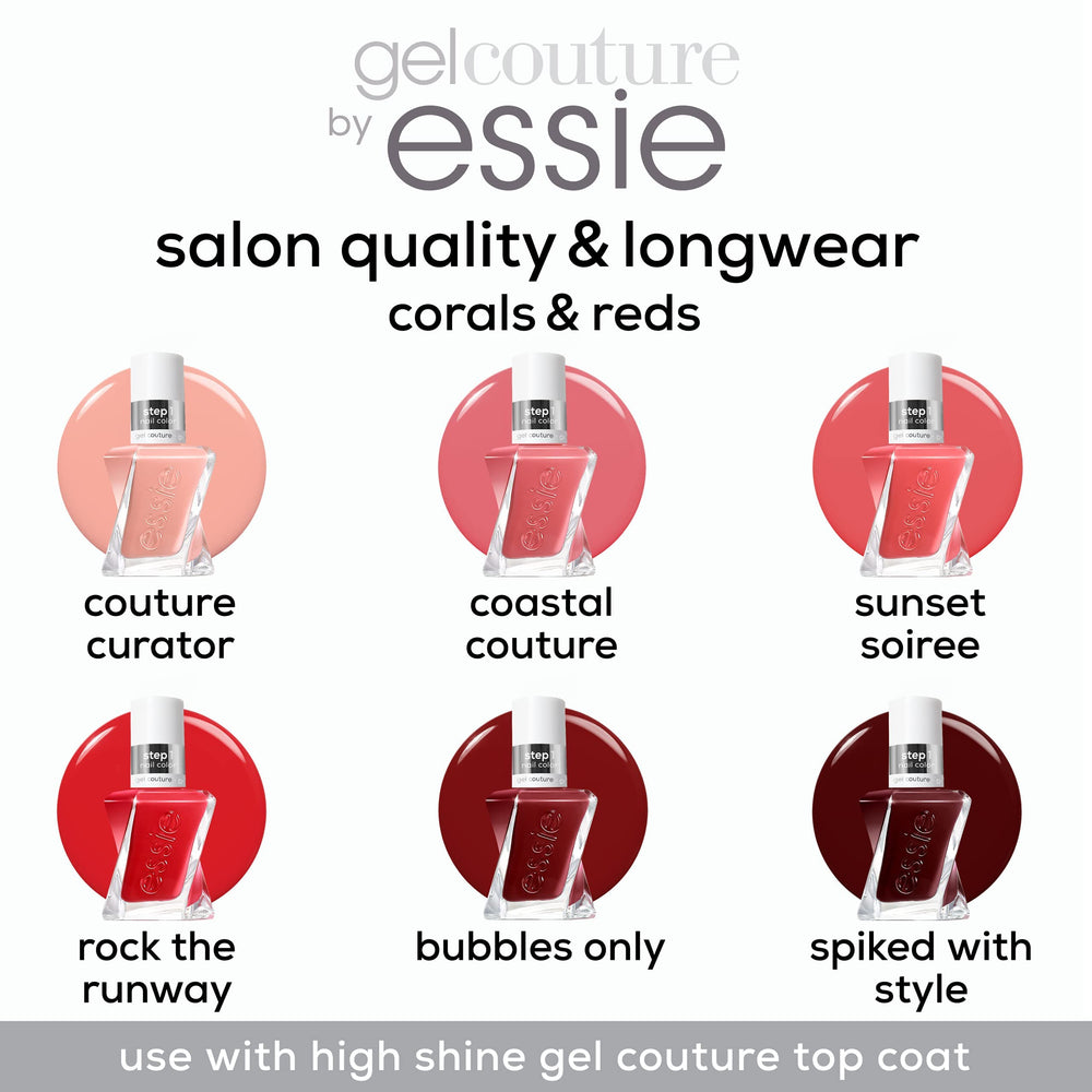 from the house of essie comes gel couture nail polish, an extravagantly sophisticated collection, crafted to perfection and fashioned to last. designed with the haute vision of couture, the line presents 42 brand new colors with staying power that introduces luxury to your fingertips. perfect for both salon and at-home application, the instant gel-like shine is delivered in an easy 2-step system that anyone can master. the patent-pending curve hugging color brush guarantees perfect coverage and a flawless finish. no uv lamp needed, easy removal. all essie nail polishes are dbp, toluene and formaldehyde free.