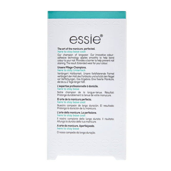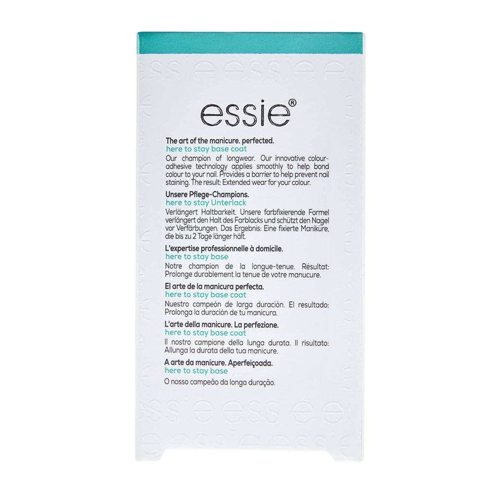 the art of the manicure perfected, from America's nail salon expert: high performance essie top coats, base coats and treatments, for every detail of your manicure, the perfect compliment to any essie nail polish color. bring the salon experience home with essie Here to Stay, our longwear base coat formula that uses color-adhesive technology to help bond essie color to your nail and prevent nail staining. the result: extended wear for your manicure.