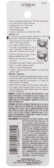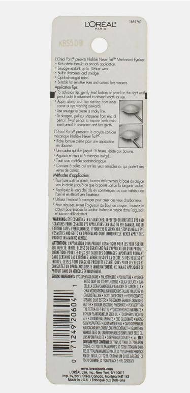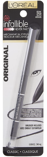 Create classic to bold eye designs with Infallible Never Fail Mechanical Eyeliner. The rich and creamy formula glides on easily and evenly for fade-proof color that stays all day. Use the built-in smudger and sharpener to create versatile eye looks for any occasion. Packaging may vary. What you receive may not be what is reflected on site. • Mechanical Pencil Eyeliner • Rich, Crème Formula • Built in Sharpener and Smudger • Smudge-proof, Up to 16HR 16-hour wear Apply along lash line starting from inner corner of eye working outwards. For a smoky look, gently smudge line with built-in smudger. Warning: Eye cosmetics in a scratched, infected or irritated eye and scratches from cosmetic eye applicators can lead to eye damage, and in extreme cases, even blindness. If your eye is scratched, stop using all eye cosmetics and go to an ophthalmologist immediately. Never apply this product in a moving vehicle.