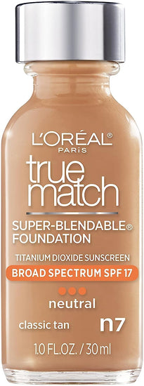 With patented color technology, L'Oreal Paris True Match Super-Blendable Foundation precisely matches your skin's tone and undertone and coordinates perfectly with True Match Powder, Blush, and Concealer. Formulated with Precise Match Technology to provide the most natural true-to-you coverage. Ultra-pure formula contains no oils, fragrances, or pore-clogging fillers, so all you see is beautiful, radiant, flawless skin. The super blendable foundation contains SPF 19 to protect skin while providing light to medium coverage with a natural finish. With Vitamins A and C, wheat germ and grape fruit extract to keep your skin nourished, protected and healthy. Finish: Natural SPF: 17 (select shades). Coverage: Light to medium coverage foundation. Skin Type: For all skin types. Oil-free. • Super Blendable Foundation • Precisely matches skin tone and undertone • Diffuses imperfections and nourishes skin • 33 True to you shades Shake well before using. Apply directly to face with fingertips or sponge. Blend in an outward motion as needed. For external use only. Avoid contact with eyes. Discontinue use if signs of irritation or rash appear. Keep out of reach of children.