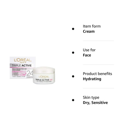 Every day the skin is under attack from UV rays, free radicals and pollution which can cause signs of skin ageing. Skin can be left feeling dehydrated and more fragile. Triple Active Day Moisturiser has 3 actions: hydration, protection and radiance. The skins ability to retain water throughout the day is improved and protection helps reinforce skins natural protection against free radicals and the harmful effects of the sun. The formula, enriched with Ceramide and Vitamin B5, leaves skin looking more radiant. Immediately your skin is intensely hydrated and feels soft and comfortable looking more radiant. To use: Massage into clean skin in the morning.