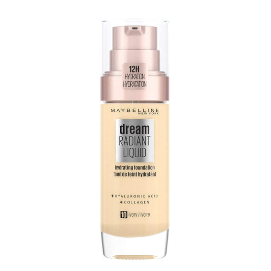 Maybelline Foundation, Dream Radiant Liquid Hydrating Foundation with Hyaluronic Acid and Collagen - Lightweight, Medium Coverage Up to 12 Hour Hydration - 10 Ivory