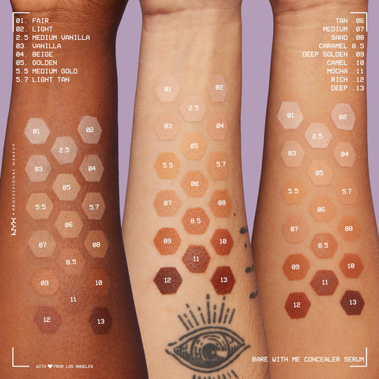 This is a skintervention! Say good-bye to skin stress with our newest addition to the Bare With Me family. Dark circles? Erased! Acne & blemishes? Covered! Redness & irritations? Girl, bye! Dry patches? Don't know her! Infused with skin-loving ingredients tremella mushroom, cica, and green tea for up to 24HRs of hydration. Available in 13 ultra-hydrating shades with a medium coverage, non-cakey natural finish. For under-eye, face and body. 100% vegan & cruelty-free formula. Skin stress? Not today! Cover and hydrate by applying one pump of Bare With Me Concealer Serum to the skin using a blending brush. Apply two pumps on problem areas (dark circles, acne/blemishes, redness/irritations, dry patches) for medium coverage.