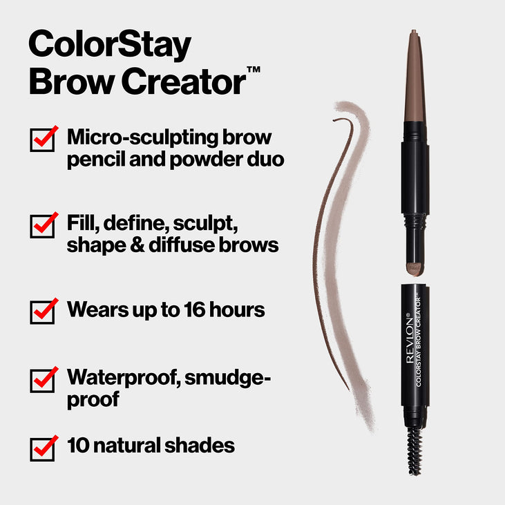 The Revlon Colorstay Brow Creator ™ is a micro eyebrow pencil with 5 benefits in 1 to fill, define, sculpt, shape and diffuse brows. The ultra-precise, micro-sculpting eyebrow pencil glides on effortlessly, blending with your natural brow color, while adding detailed definition and filling in sparse areas. Go from natural to bold, available in 10 natural shades.