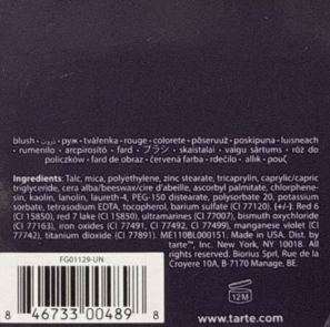 A long-wearing, solar-baked blush that lasts up to 12 hours. Infused with natural clay harvested from the banks of the Amazon River and naturally baked by the sun, this nutrient-rich blush benefits all skin types for a fade-free flawless finish for an amazing 12 hours. Inspired by Tarte's bestselling shades of cheek stains and lip tints, the colors range from soft to vivid to suit a wide variety of skintones. For oily skin types, Amazonian clay minimizes oil in and around pores to balance skin and keep product in place. Those with dry skin will benefit from the clay's nourishing and hydrating properties, which naturally restore skin's moisture. Combination skin types can rely on its ability to zero in on skin concerns and deliver benefits to restore complexion harmony. The result? Blush that wears better, longer, and truer! It is formulated Without: - Parabens- Sulfates- Synthetic Fragrances- Petrochemicals- Phthalates- GMOs- Triclosan