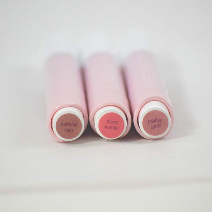Treat & tint your lips with this trio set of vegan maracuja juicy lip balm. This limited edition includes 3 lip tintin' shades: merry martini (shimmering pink), buttered rum (deep rosy beige), holiday spritz (pink beige). It contains Skinvigorating ingredients which include 10+ antioxidant-rich fruits to helps smooth & nourish while drenches it in moisture for healthy lips. HOW TO USE: 1. Non-retractable click reveals the perfect amount of product every time, so click up once 2. Apply 1 swipe as a treatment balm (perfect for errands or bedtime) 3. Swipe on multiple layers for the perfect pop of color