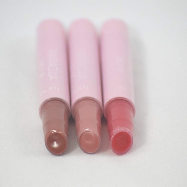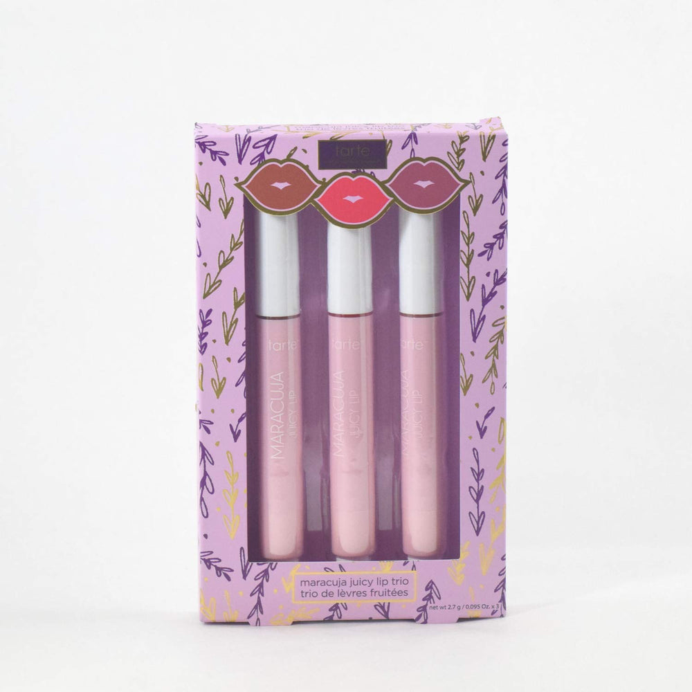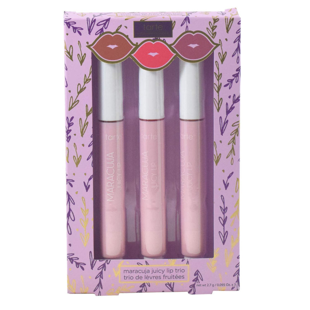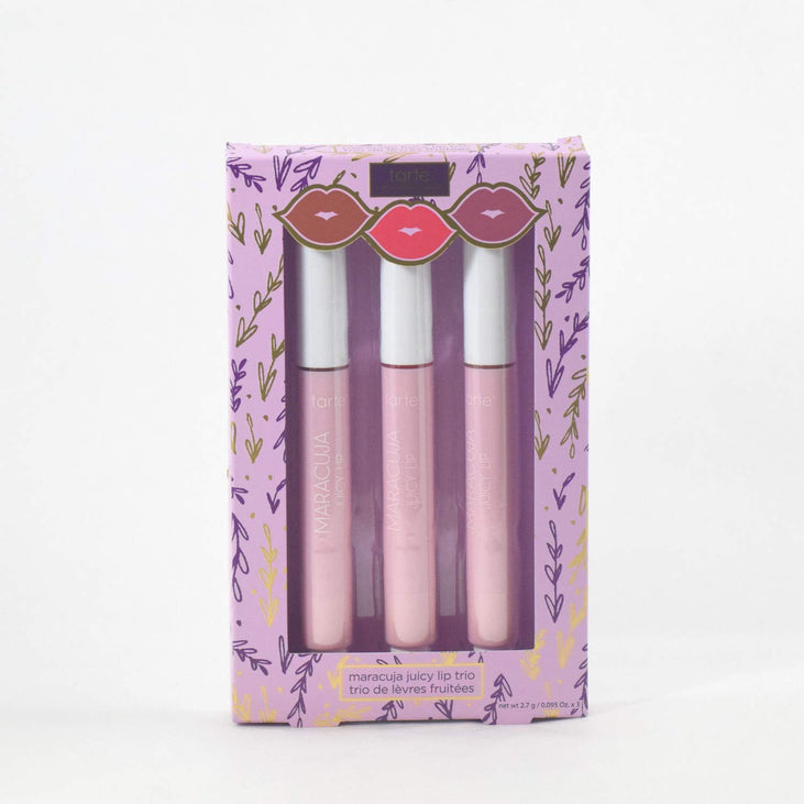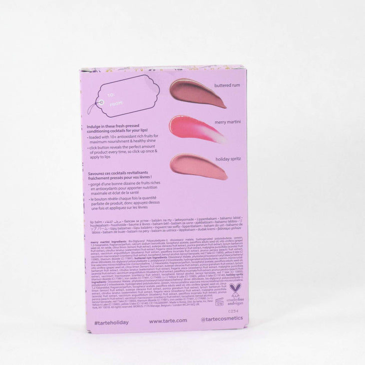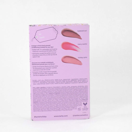 Treat & tint your lips with this trio set of vegan maracuja juicy lip balm. This limited edition includes 3 lip tintin' shades: merry martini (shimmering pink), buttered rum (deep rosy beige), holiday spritz (pink beige). It contains Skinvigorating ingredients which include 10+ antioxidant-rich fruits to helps smooth & nourish while drenches it in moisture for healthy lips. HOW TO USE: 1. Non-retractable click reveals the perfect amount of product every time, so click up once 2. Apply 1 swipe as a treatment balm (perfect for errands or bedtime) 3. Swipe on multiple layers for the perfect pop of color